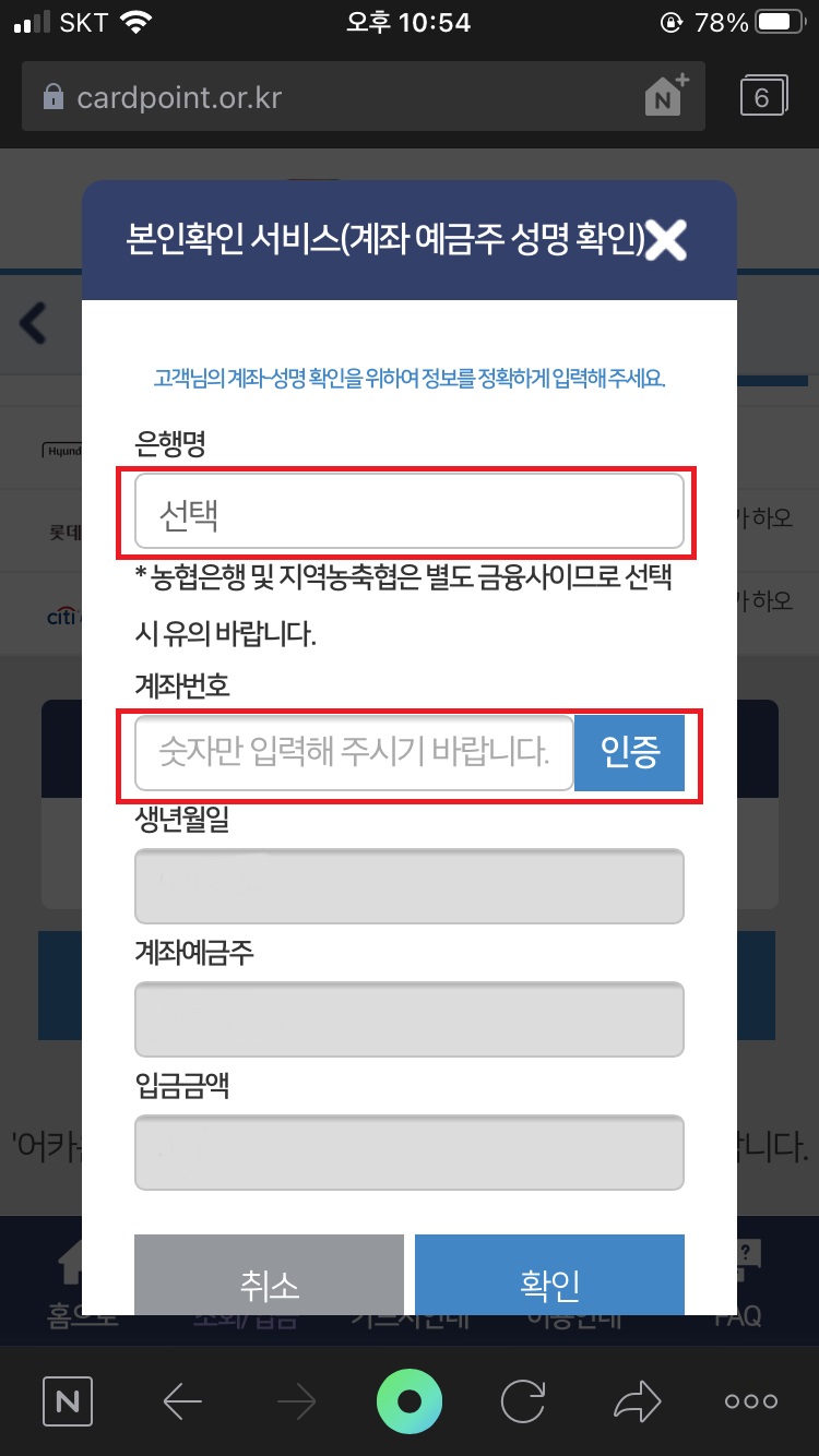 12. ํฌ์ธํธ๋ฅผ ํ๊ธํ ํ์ฌ ๋ฐ์ ์ํ, ๊ณ์ข๋ฒํธ๋ฅผ ์ ๋ ฅํ์ฌ ์ธ์ฆ์ ๋๋ฅด๋ฉด ๊ณ์ข ์๊ธ์ฃผ ๋ฑ์ ํ์ธํ ์ ์๊ฒ๋ฉ๋๋ค. ์๊ธ์ฃผ ํ์ธ์ ํ์ฌ ์ต์ข ์ ์ผ๋ก ์นด๋ํฌ์ธํธ๋ฅผ ํ๊ธํ ํ์๊ธฐ ๋ฐ๋๋๋ค.